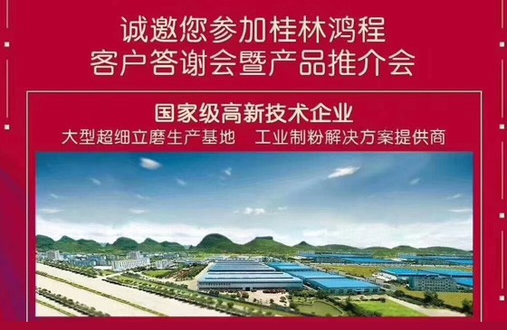 磨粉機(jī)廠家桂林鴻程公司2019年6月6日在河南南召縣舉行客戶答謝會(huì) 磨粉機(jī)廠家桂林鴻程公司計(jì)劃于6月6日在河南南召縣舉行客戶答謝會(huì)暨產(chǎn)品推介會(huì),誠(chéng)邀各界人士參...